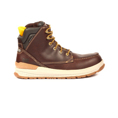 The Caterpillar Impact WP CCT (Waterproof Composite Toe) is a work boot designed for the modern worker, offering durability, comfort, and safety features. It features a waterproof construction, a carbon composite toe for lightweight protection, and a ReVive Tech engineered comfort system for cushioning and energy return. The boot also includes electrical hazard protection, a slip-resistant outsole, and a nylon shank for support.