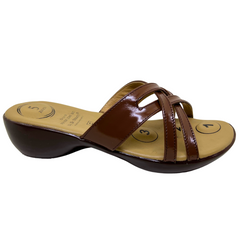 A pair of black & brown cross strip slippers ,has regular ankle and open back Leather solid upper with other Cushioned footbed Textured and patterend out...