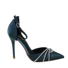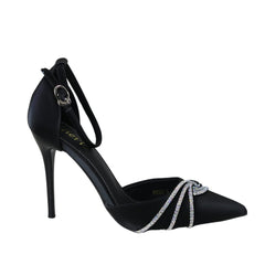 synthetic fibre, rhinestones, solid colour with appliqués, fully lined, buckling ankle strap closure, narrow toeline, stiletto heel, rubber cleated sole, ankle-strap pumps
